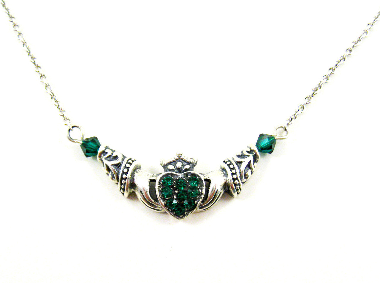 An Irish wedding or friendship necklace adorned with crystals and Swarovski crystals. There are fancy details on the sleeves and crown. Antique finish adds to the romance.