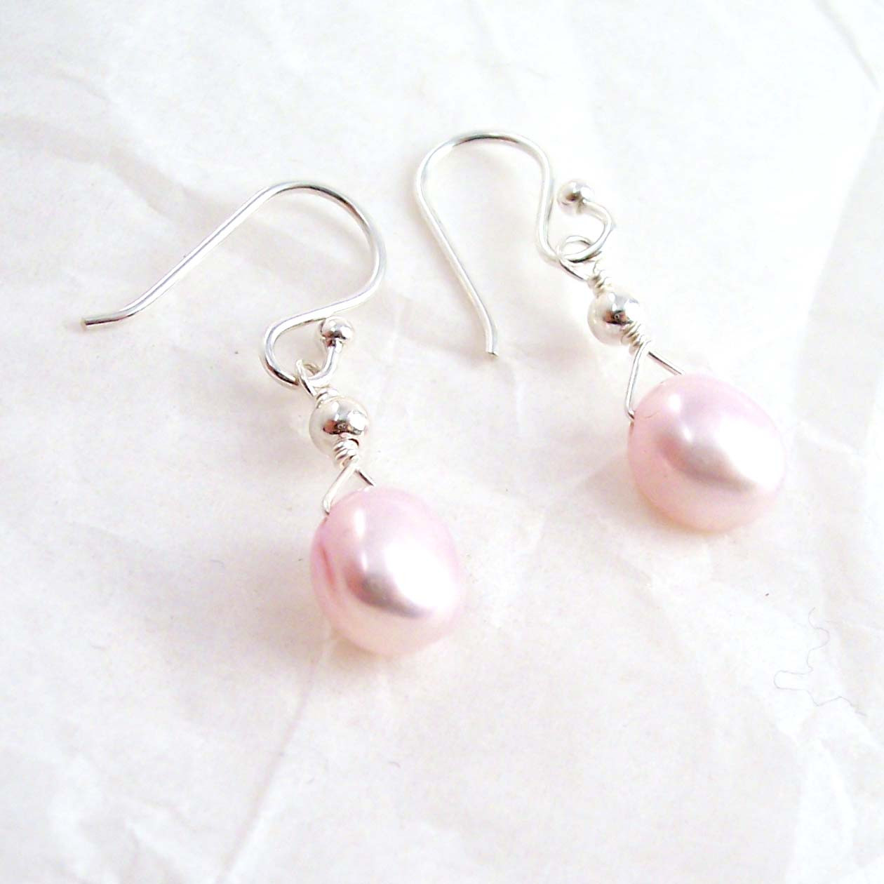 Simple button cultured pearl and silver ball drop earrings. They hang approximately 1 inch long. The pearl is 7 mm. Please note written dimensions as photo is enlarged to show detail.