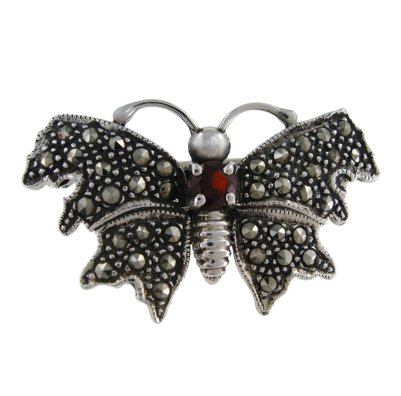 Sterling silver, garnet and marcasite butterfly brooch. Pin is 1 7/16 inch wide. 7/8 inch tall. Beautiful piece to adorn your jacket, hat, or scarf.