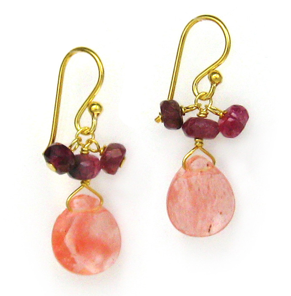 Gold Plated Sterling Silver Crystal Briolette Drops and Stone Cluster Earrings, Cherry Quartz