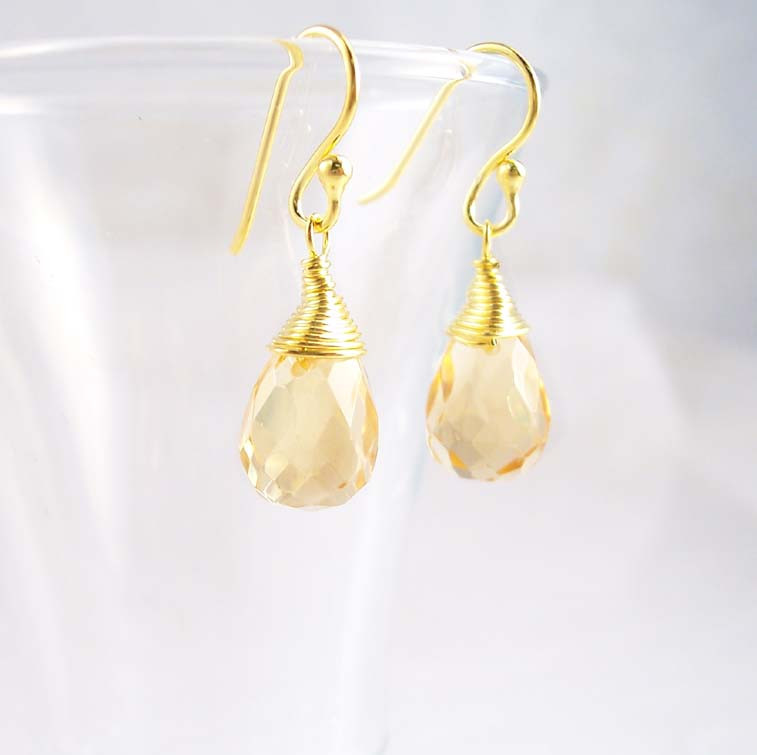 Gold plated sterling silver teardrop stone with coil-wrapped top drop earrings. Earring is approx. 1 1/16 inch drop from top of hook. Fishhooks for pierced ears.
