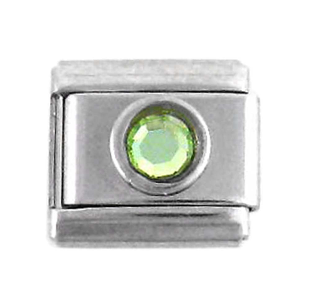 Italian link charm with rhinestone center. Sport your favorite color or the color of your birthmonth! Link is 9 mm by 10 mm. Photo is enlarged to show detail.