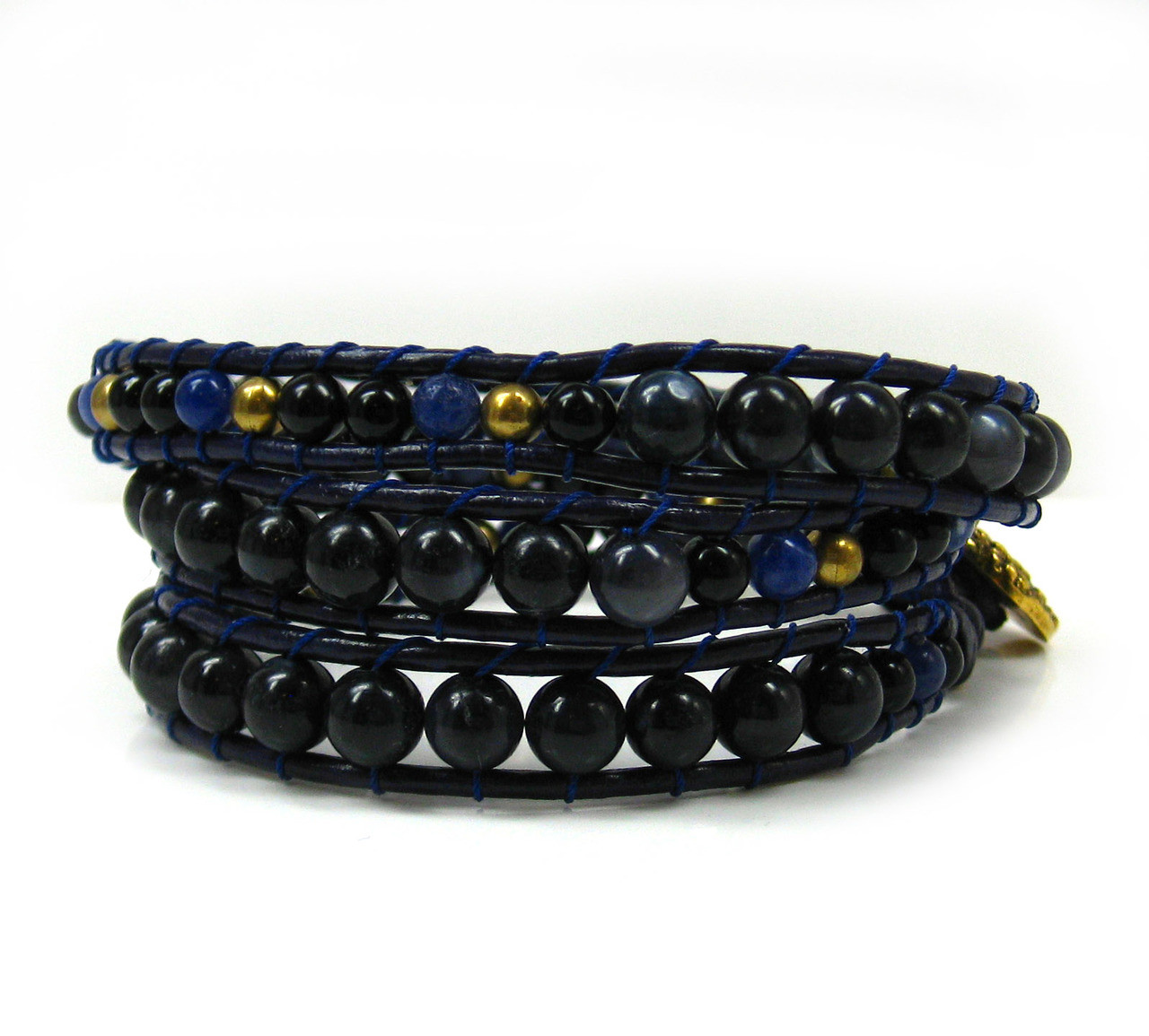 Loading... Please wait...Edge and elegant is a beautiful mix in this wrap bracelet. Adjustable bracelet can accommodate many wrist sizes. Navy color leather. Stones in two sizes for visual impact: black mother of pearl, sodalite, black agate, golden tone bead. Gold tone with flower design button closure. Photo enlarged to show details.