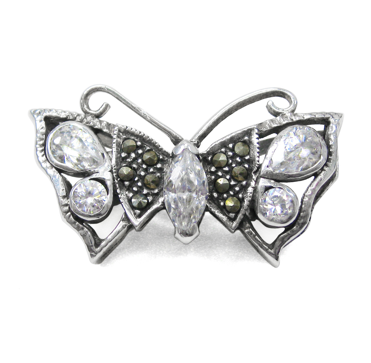 Butterfly encrysted with marcasite stones and set with sparkling cubic zirconia stones in this beautiful sterling silver brooch pin. Butterfly is approximately 1 3/16 inch wide and 5/8 inch tall.