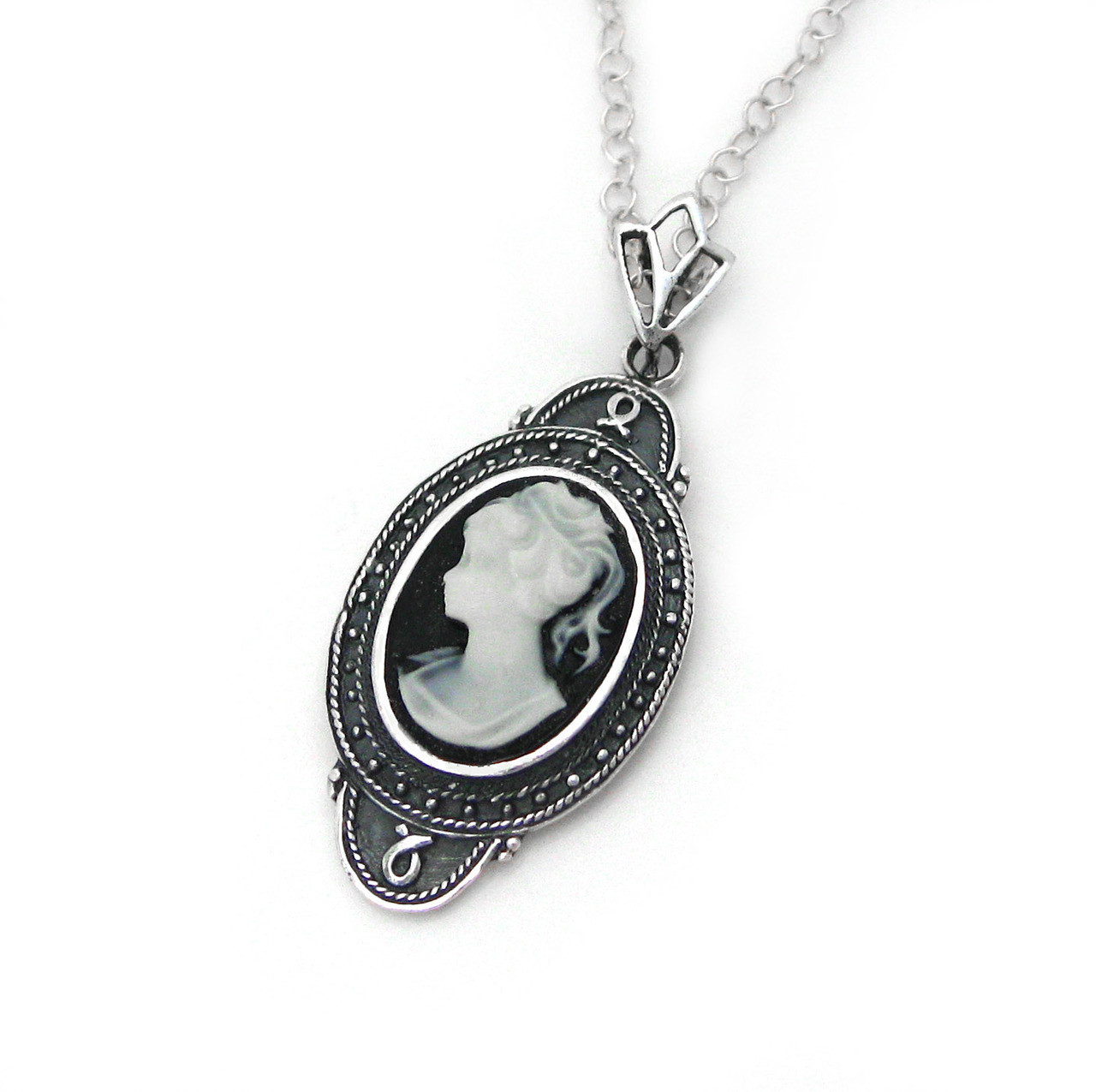 Victorian era vintage style cameo necklace. Romantic and timelessly elegant resin cameo is framed in sterling silver with antique finish. Necklace chain is adjustable from 16 to 18" long, versatile and accommodating to different necklines. Photo enlarged to show details.