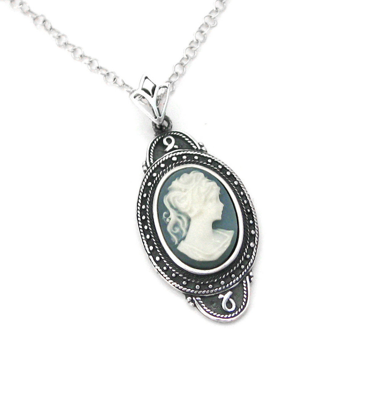 Victorian era vintage style cameo necklace. Romantic and timelessly elegant resin cameo is framed in sterling silver with antique finish. Necklace chain is adjustable from 16 to 18" long, versatile and accommodating to different necklines. Photo enlarged to show details.