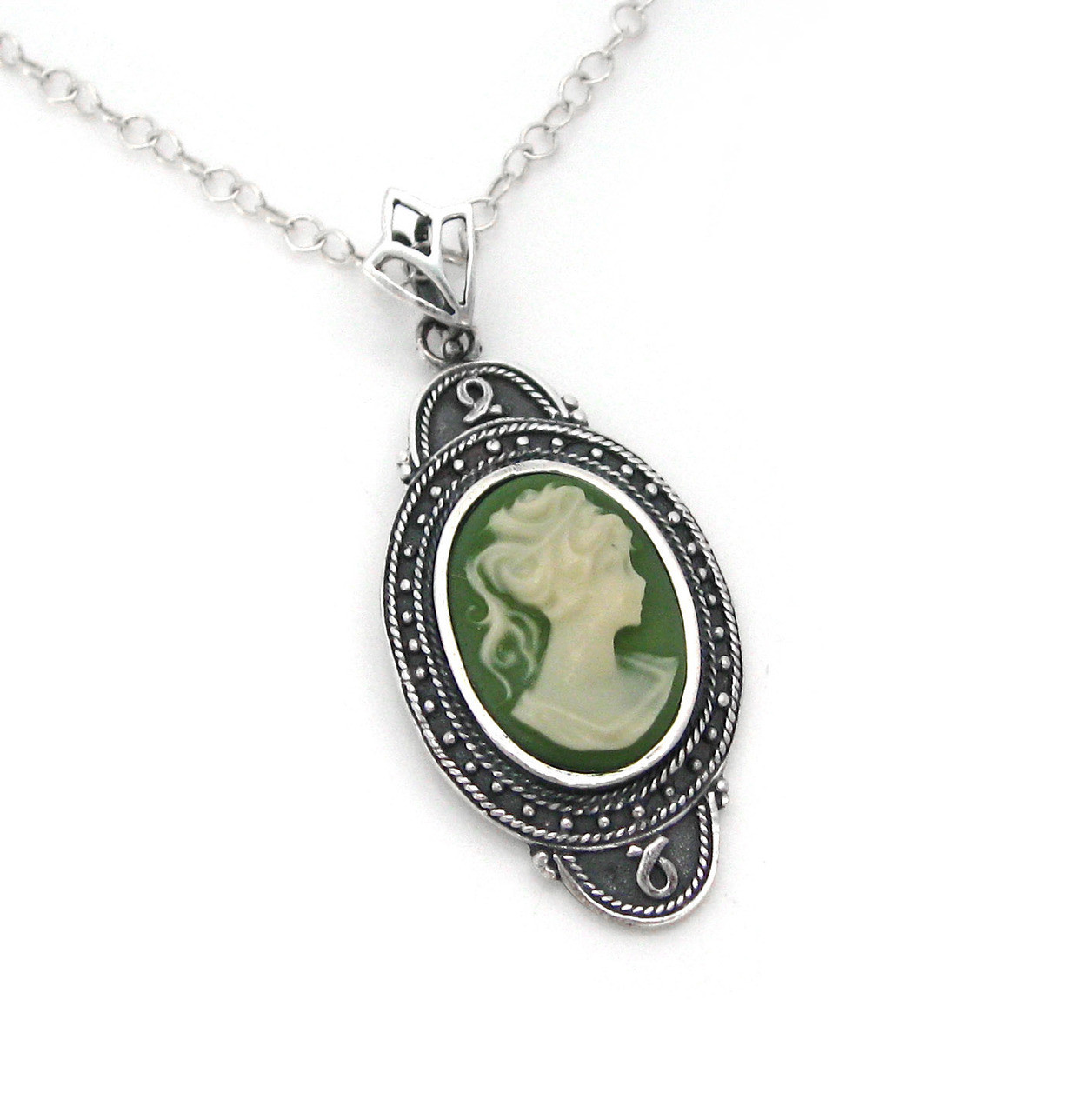 Loading... Please wait...Victorian era vintage style cameo necklace. Romantic and timelessly elegant resin cameo is framed in sterling silver with antique finish. Necklace chain is adjustable from 16 to 18" long, versatile and accommodating to different necklines. Photo enlarged to show details.