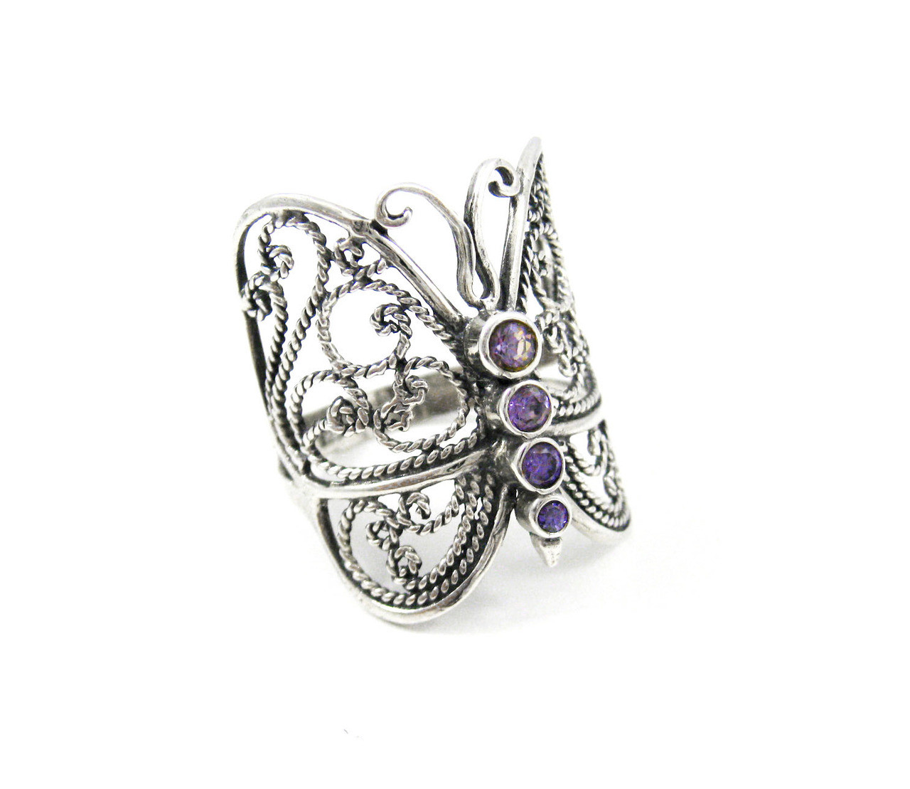 Get noticed with this beautiful butterfly ring. Adorned with four genuine amethyst stones in graduating size down the body of the butterfly. The filigree swirls lend this ring its delicate beauty.