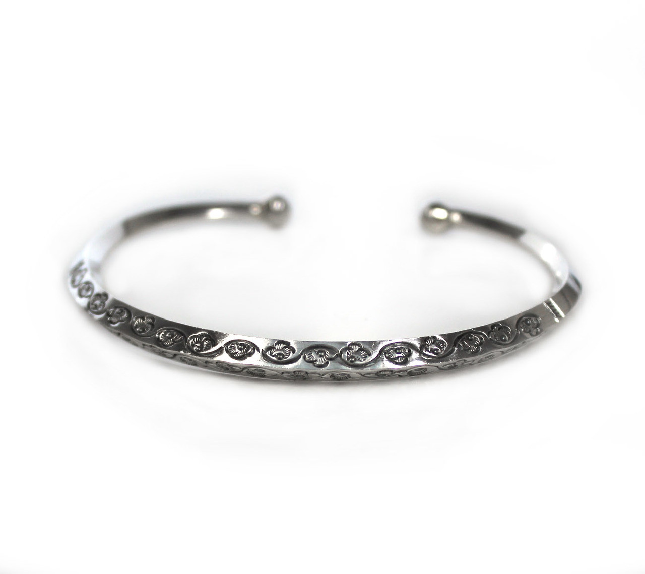 Sterling silver floral design cuff bracelet. Angular structure for a modern look. Antique finish to enhance the floral design.