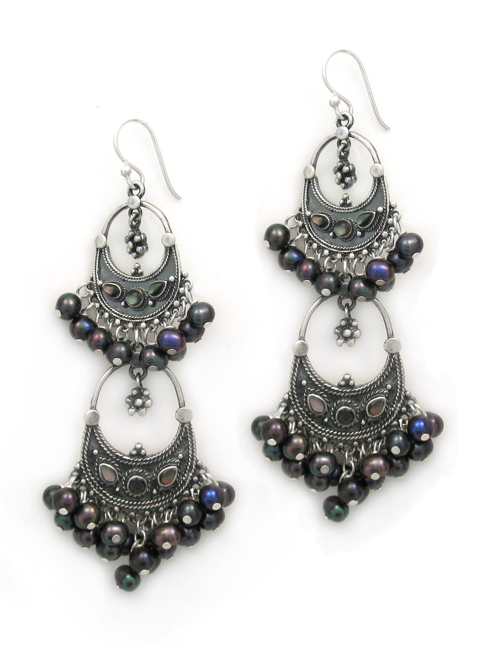 These earrings ooze bohemian chic with a modern vibe. Two tiers of cultured pearl beads dangling at the bottom give movement and color. Shell inlay is matched to the beads' color. Antique finish on polished silver. Cultured pearls may vary in color and shapes. Earring is approx. 2 7/8 inch long. Fishhooks for pierced ears. Photo enlarged to show details.