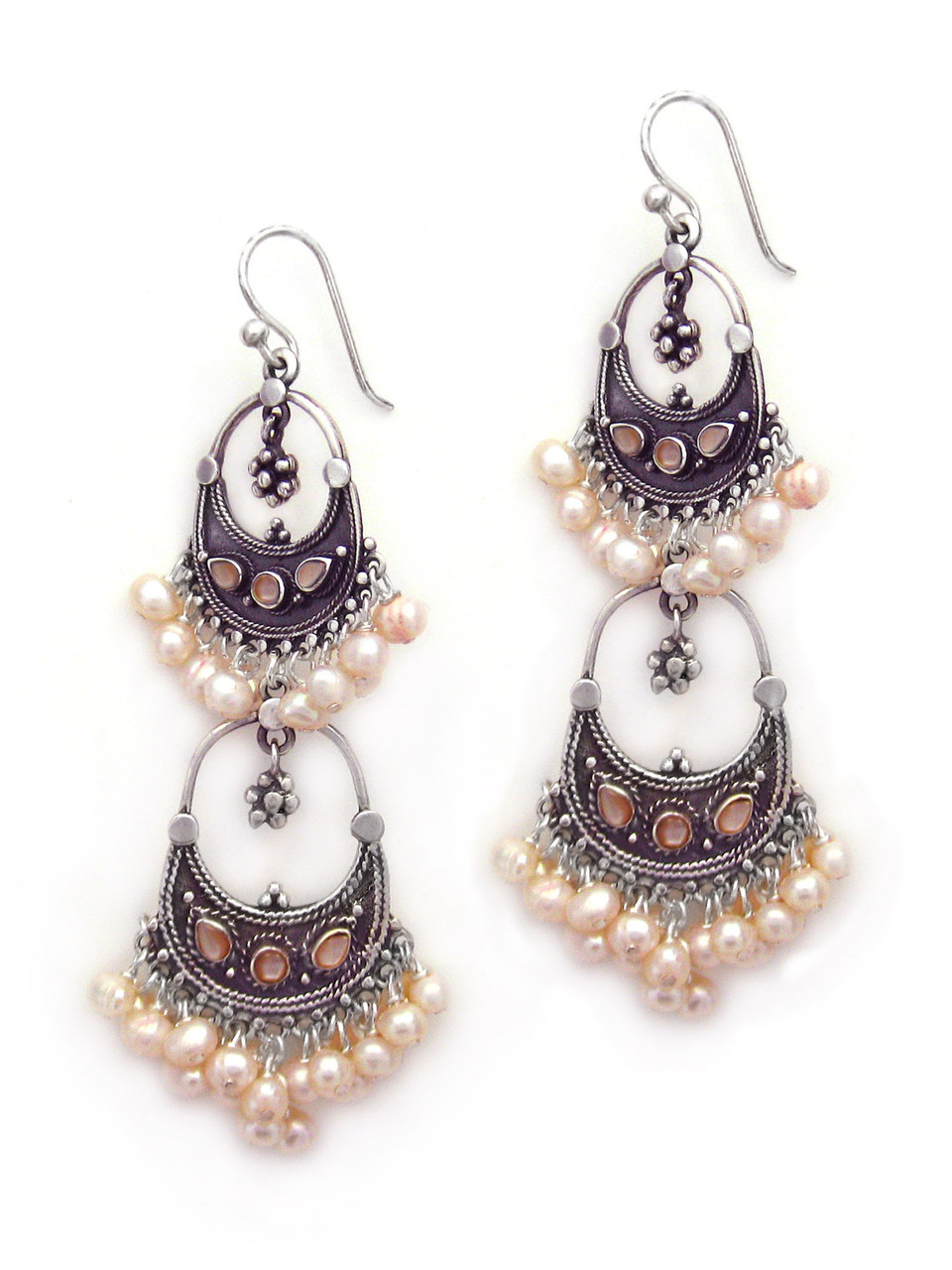 Loading... Please wait...These earrings ooze bohemian chic with a modern vibe. Two tiers of cultured pearl beads dangling at the bottom give movement and color. Shell inlay is matched to the beads' color. Antique finish on polished silver. Cultured pearls may vary in color and shapes. Earring is approx. 2 7/8 inch long. Fishhooks for pierced ears. Photo enlarged to show details.