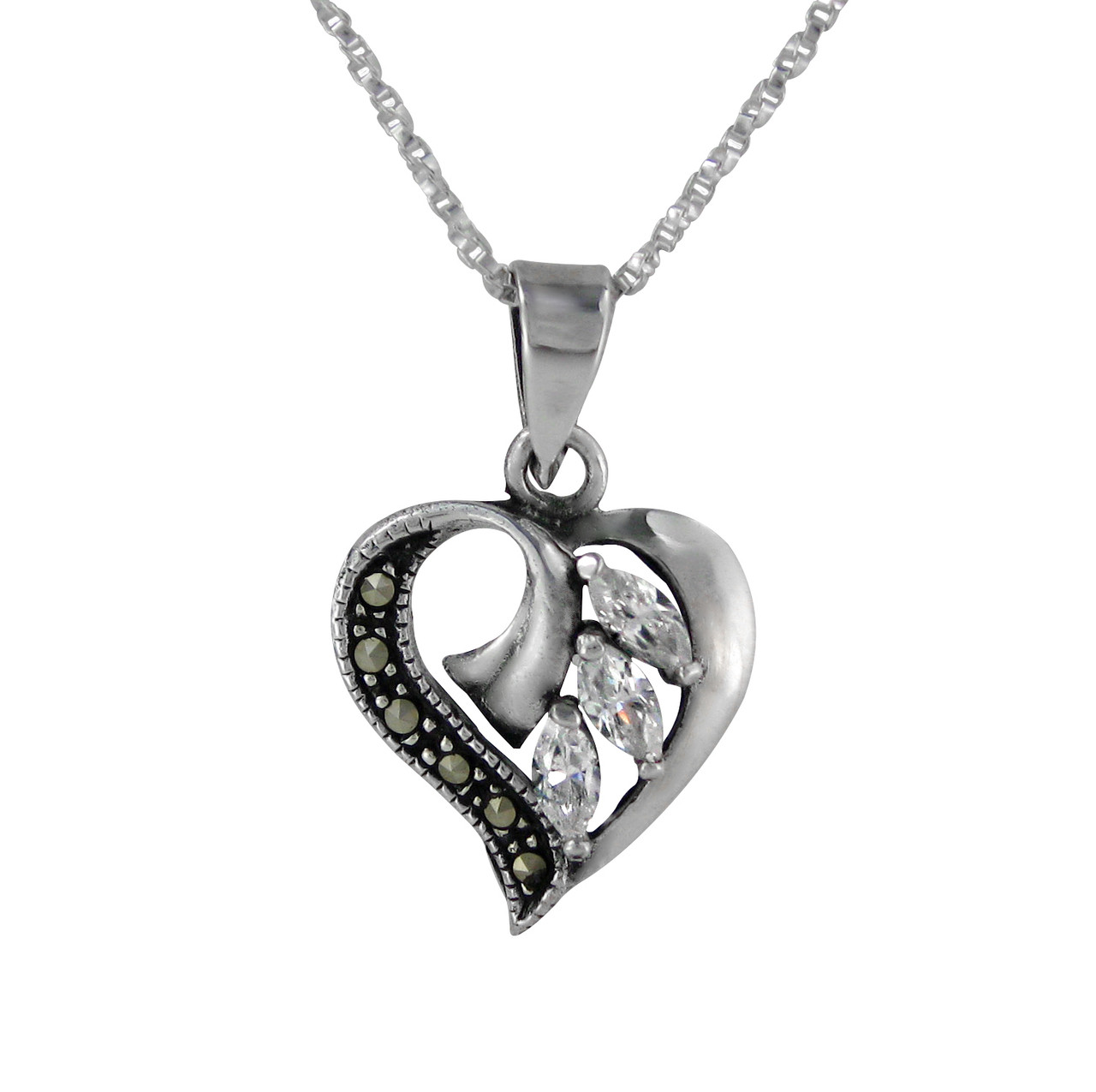 Elegant open heart birth crystal and marcasite pendant necklace. Heart is 5/8 inch wide and 1 inch tall. A nice size to wear everyday. Antique finish on 925 sterling silver. Sterling silver twisted box chain included.