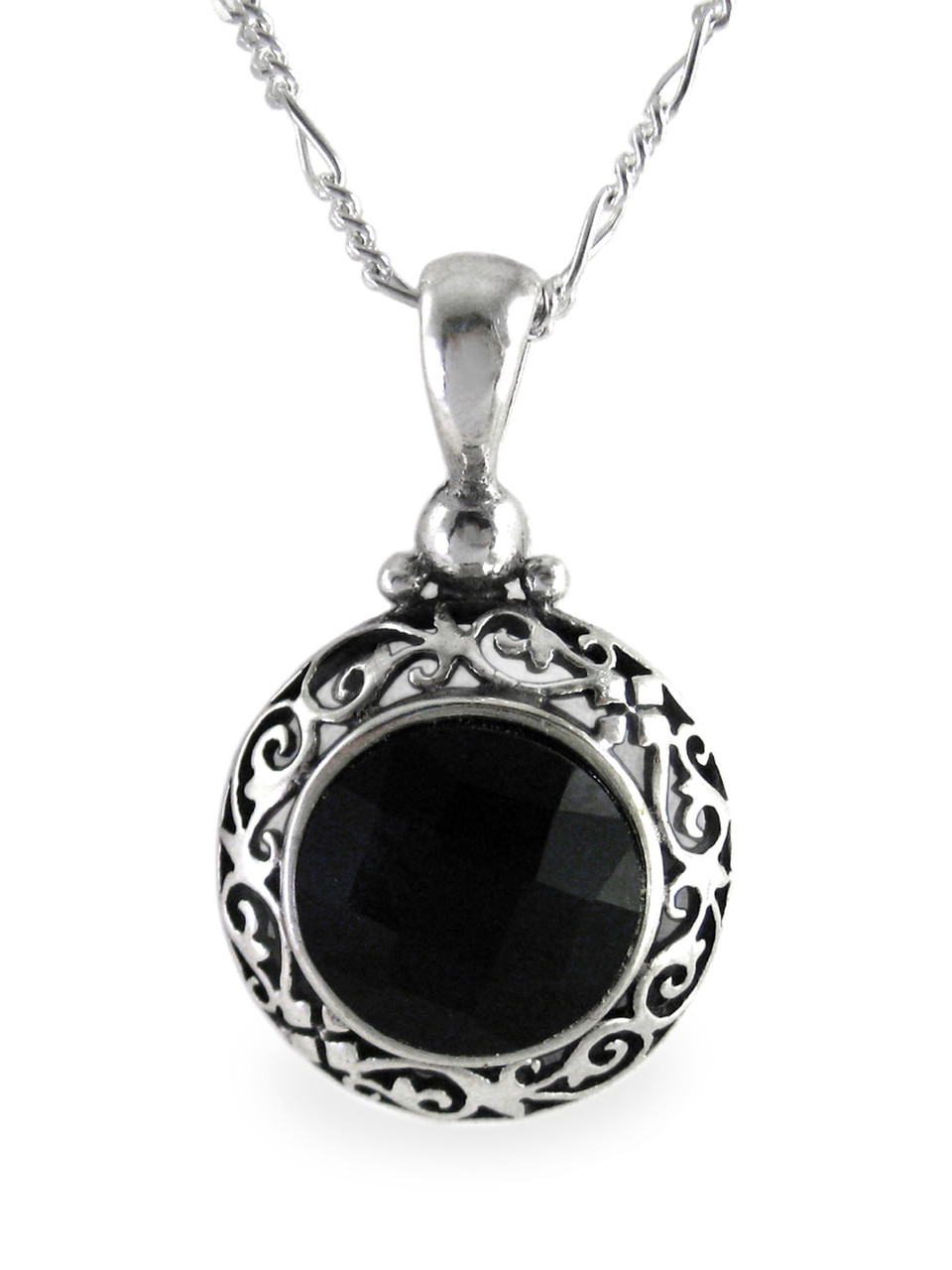 Loading... Please wait...Sparkling faceted black crystal is the centerpiece of this elegant pendant. Fine and fancy swirl design in antique finish sterling silver frame the stone perfectly. Design and details evoke timeless elegance and is perfect for any occassion. Photo enlarged to show details.