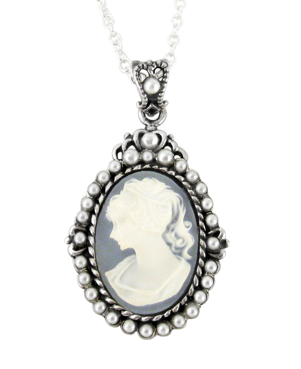 Victorian era vintage style cameo pendant on adjustable necklace chain. Necklace chain is 16" long with 2" extender chain. Romantic and timelessly elegant resin cameo is framed with pearlized beads. Cameo pendant is 7/8" wide (21mm). Cameo pendant is 1 1/2" tall (37mm) with bail. Synthetic pearl and resin cameo. Sterling adjustable chain included, 16"-18" long.