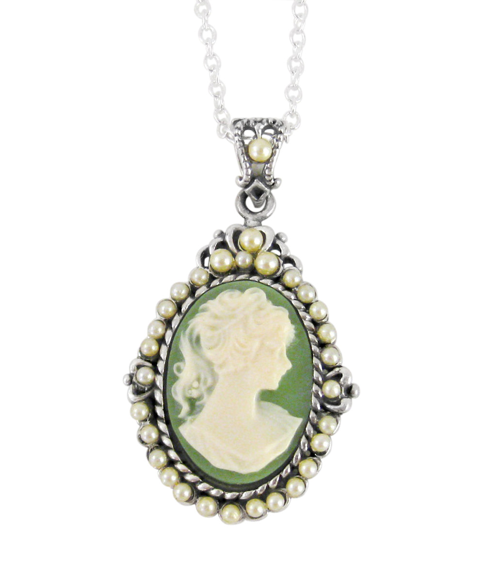 Sterling Silver "Blythe" Resin Cameo and Pearlized Beads Frame Pendant Necklace, 16-18" Green