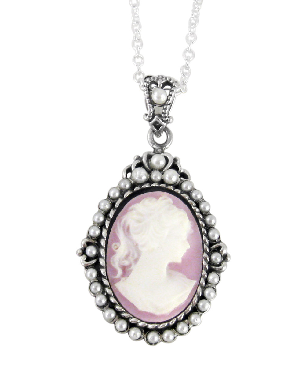 Victorian era vintage style cameo pendant on adjustable necklace chain. Necklace chain is 16" long with 2" extender chain. Romantic and timelessly elegant resin cameo is framed with pearlized beads. Cameo pendant is 7/8" wide (21mm). Cameo pendant is 1 1/2" tall (37mm) with bail. Synthetic pearl and resin cameo. Sterling adjustable chain included, 16"-18" long.