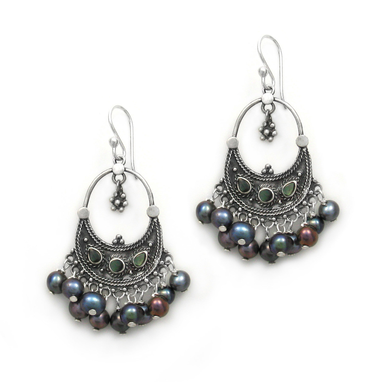 Sterling Silver Bohemian "Arya" Shell Inlay Cultured Freshwater Pearls Cluster Earrings, Peacock Pearls