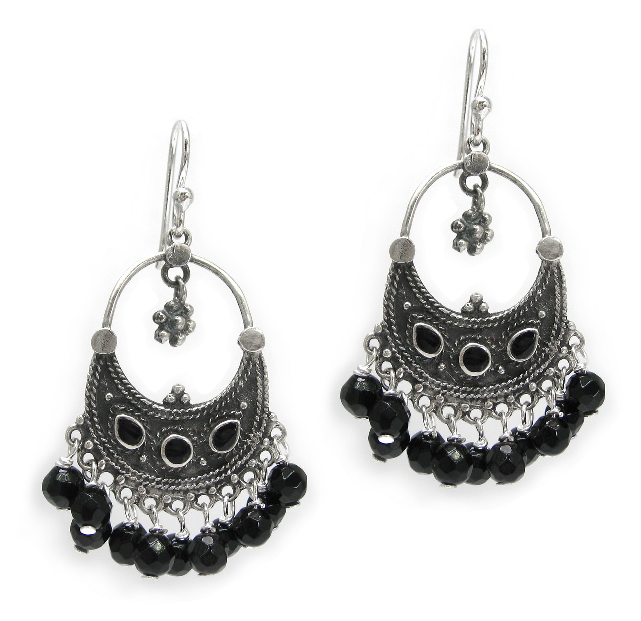 Loading... Please wait...These earrings ooze bohemian chic with a modern vibe. Stone beads dangling at the bottom give movement and color. Stone inlay is matched to the beads' color. Antique finish on polished silver. Sterling silver, reconstituted stones. Photo enlarged to show details.