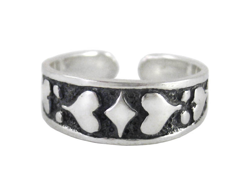 Loading... Please wait...Bold hearts and diamond shape design in high contrast to the antiqued background. Band toe rings are perfect for summer accessorizing. Antique finish on polished silver. Band slightly tapers to the back for comfort. Slide on toe ring from the top of the toe, do not bend the band open. Adjustable toe ring accommodates many sizes. Photo enlarged to show details.