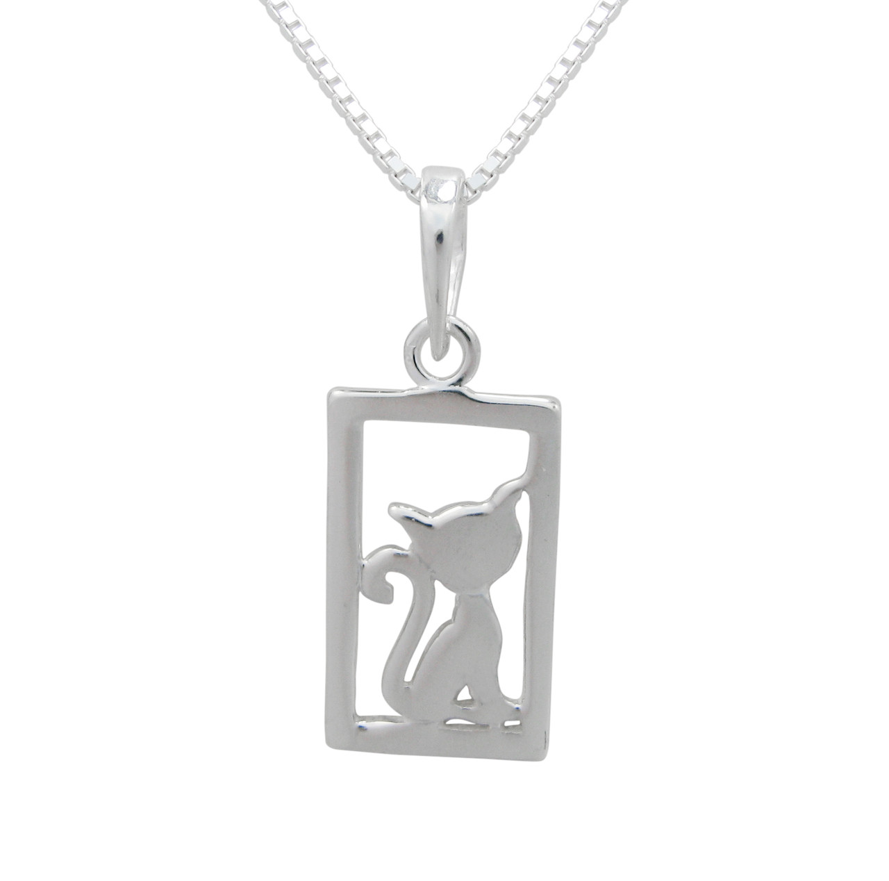 Sterling silver cat in a rectangle window charm pendant necklace. Pendant is approx. 3/8 inch (10mm) wide and 1 inch tall including bail. Cute cat silhouette cutout charm.