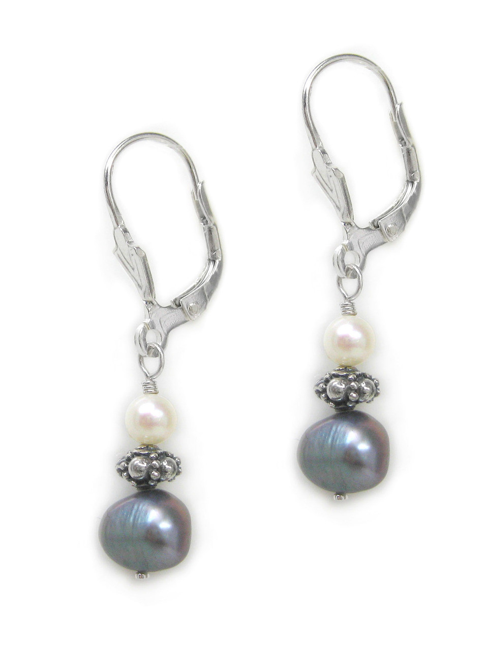 Sterling silver cultured pearl, silver bead, and natural shaped pearl drop leverback earrings. Earring is approx. 1 3/8 inch drop. Pearls may vary in color, appearance, and shape. Leverback hooks.