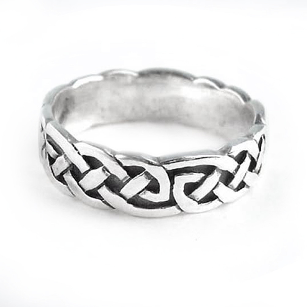 A Celtic knot design band ring. The pattern goes all the way around. The knot has a dimensional quality with each strand seeming to weave in front or behind other strands.