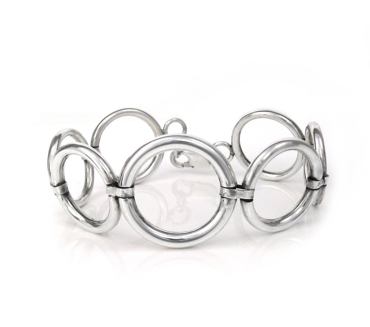 Dramatic with simple elegance circle link bracelet. The largest circle is at the center with smaller circles graduating in size link together to finish with a lobster clasp.