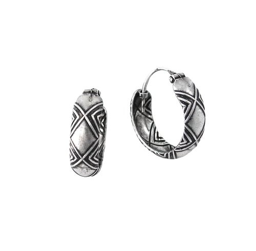 Loading... Please wait...Sterling silver 16mm hoop with criss cross design. Antique finish. Nice size to be noticed and still light enough to comfortably leave in and wear everyday. Sterling silver 925. Hoop is 5/8" wide (16mm). Hoop is a 3/16" band (5mm). Antique finish.