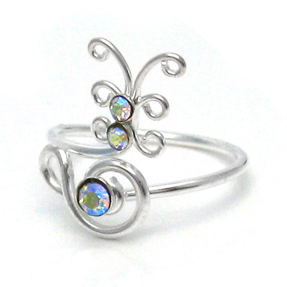 Crystal accented butterfly and swirl adjustable at the front toe ring is a great summer accessory. Slide on toe ring from the top of the toe, do not bend the band open. Adjustable toe ring accommodates many sizes. Photo enlarged to show details.