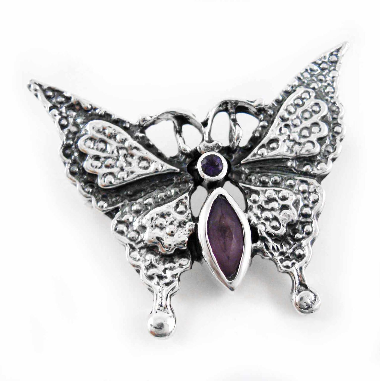 Loading... Please wait...Beautiful butterfly pin is set with a round crystal for the head and a marquise crystal for the body. Wings are textured and oxidized for a vintage look. Photos enlarged to show details, please see features for measurements.