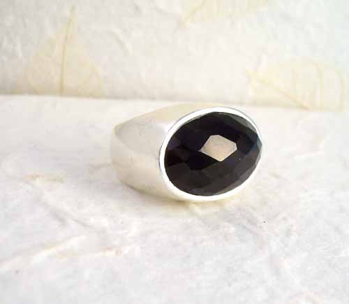Bold black crystal and silver ring. The silver has a slightly brushed finish for a modern element. Ring is 5/8 inch tall.