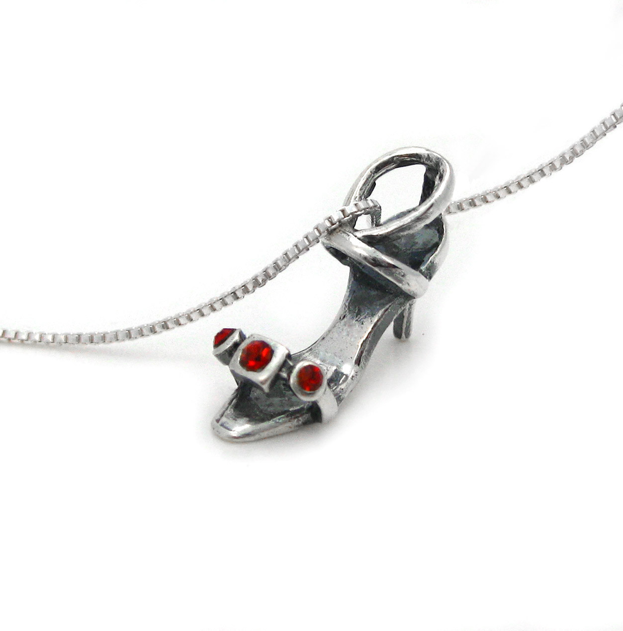 Sterling silver strapy heal charm is decorated with crystals. If you splurge on shoes then you would love to wear this necklace. Sterling chain is included. Antique finish. Photo enlarged to show details.