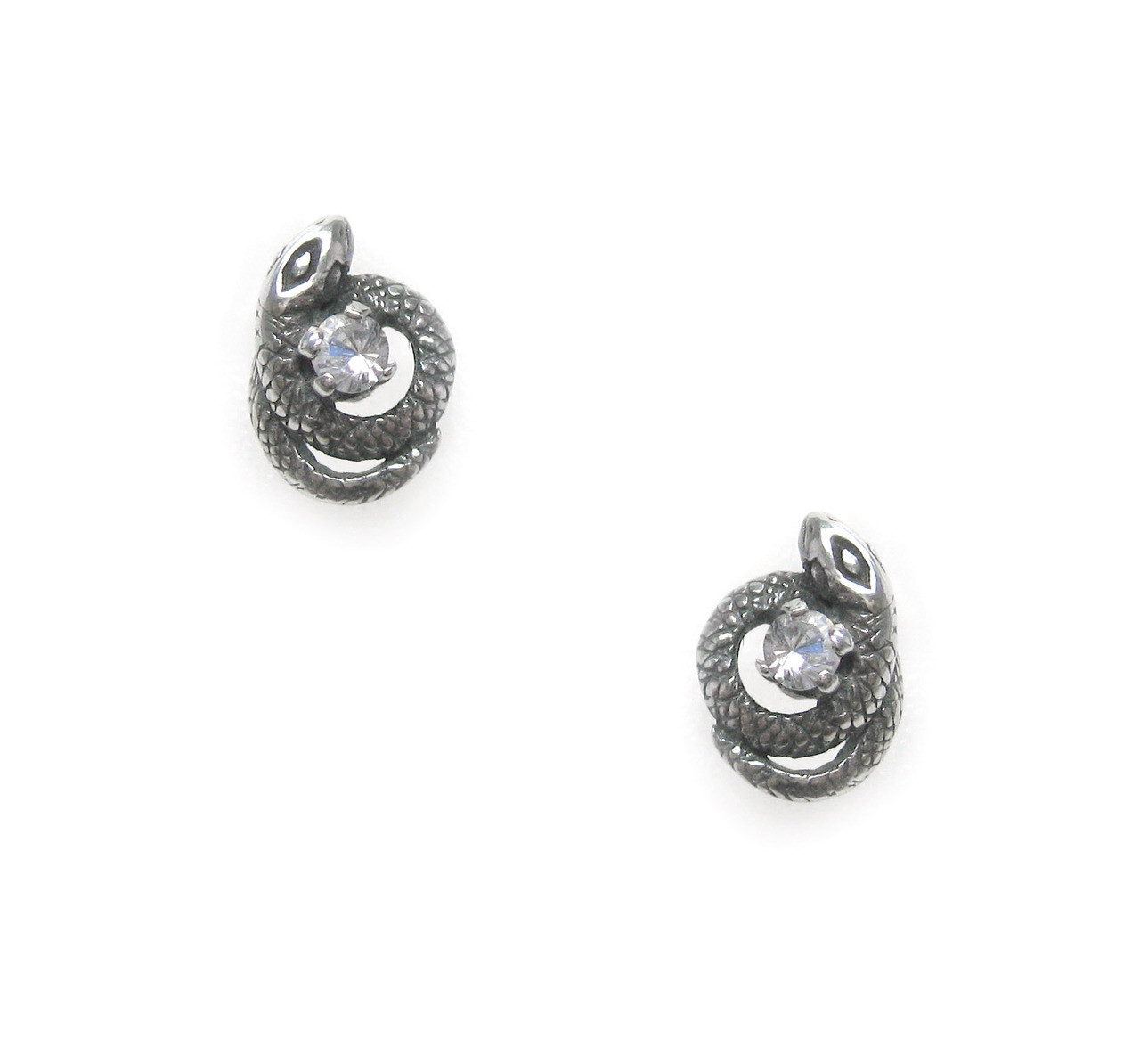 Faceted CZ's are set at the center with encircling snakes stud post earrings. Earrings are small enough to be comfortable to wear everyday. Antique finish. Photo enlarged to show details.