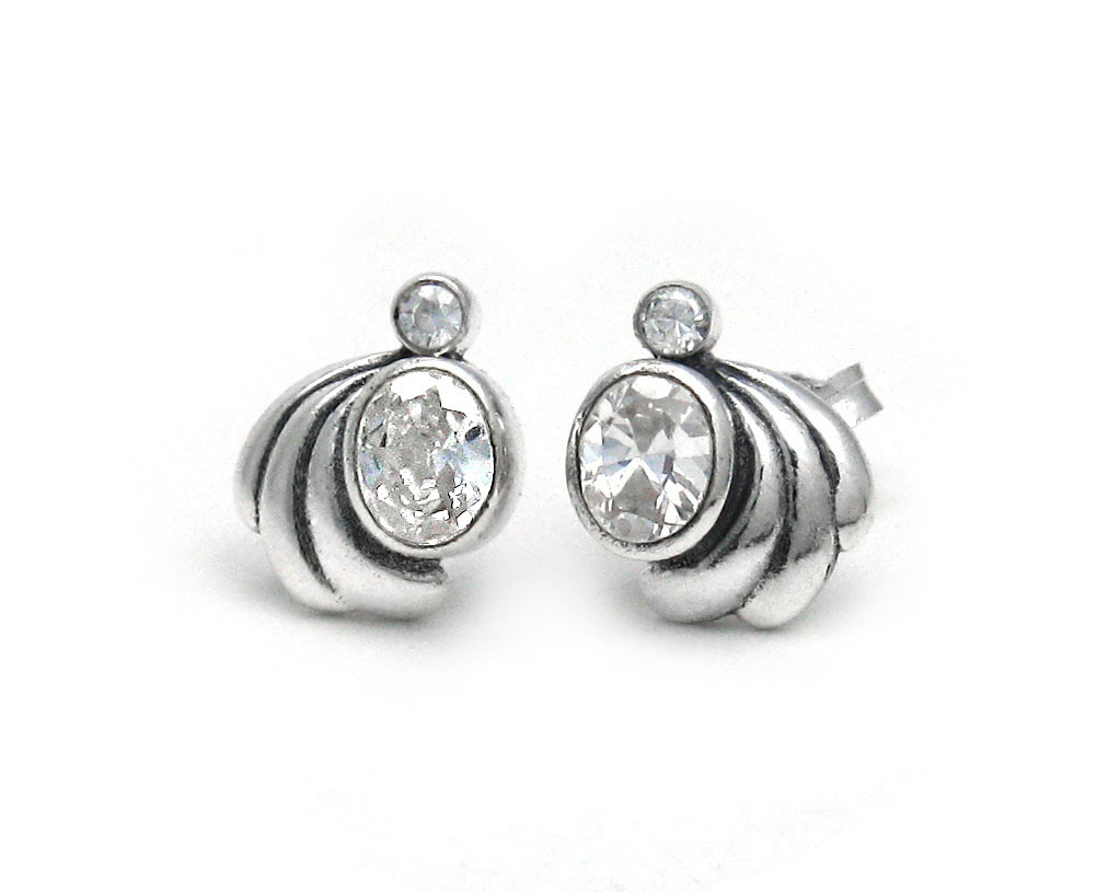 Post earrings with sophisticated side swirl design that curves around an oval shape crystal and accent with another crystal at the top. Earring is approximately 3/8 inch (9mm) wide and 7/16 inch (11mm) tall. Antique finish on polished silver. Post and butterfly backs: for pierced ears. Sterling silver, crystals, and cubic zirconia stones.