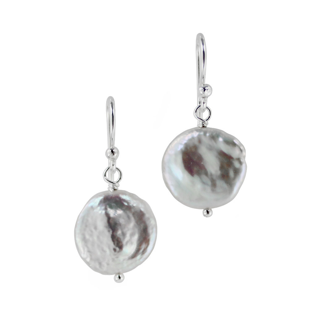 Simple, elegant cultured coin pearl drop earrings. They hang 1" long. Sterling silver.
