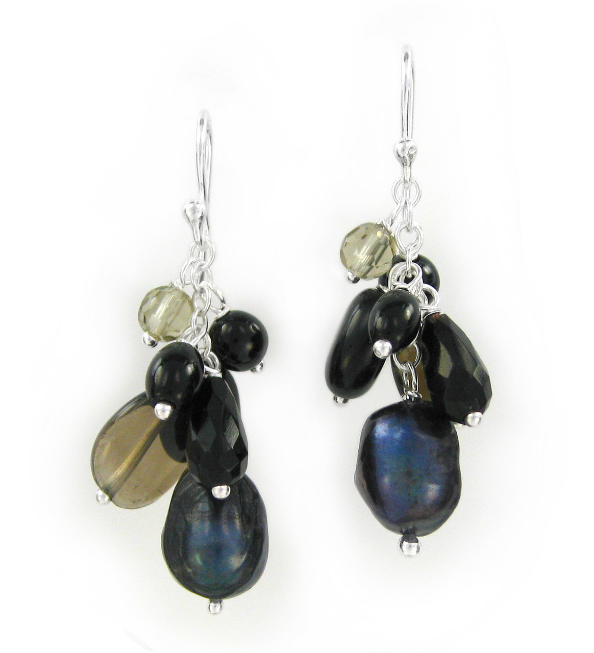 Sterling silver and mix stones cluster drop earrings. Earrings hang approximately 1 5/8 inch long. Combinations of cultured pearls, natural stones, and crystals cluster. Lovely colors that will enhance your outfit from work to play. Natural stones and cultured pearls will vary in colors, surface appearance, and inclusions. Fishhooks for pierced ears.