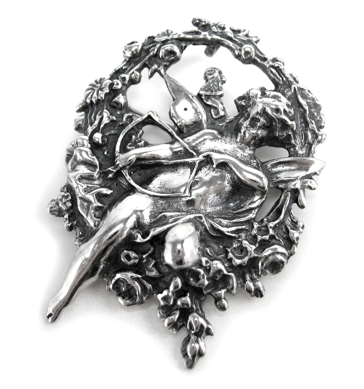 Loading... Please wait...Cupid angel has his bow poised to shoot. Designed with inspiration from vintage Victorian era, the angelic child is sitting on an ornate wreath of flowers and vines. This pin is sure to be a center piece of your outfit. Wear this pin on top of a scarf for an updated look! Approximately 1 3/8 inches wide and 2 inch tall. Antique finish.