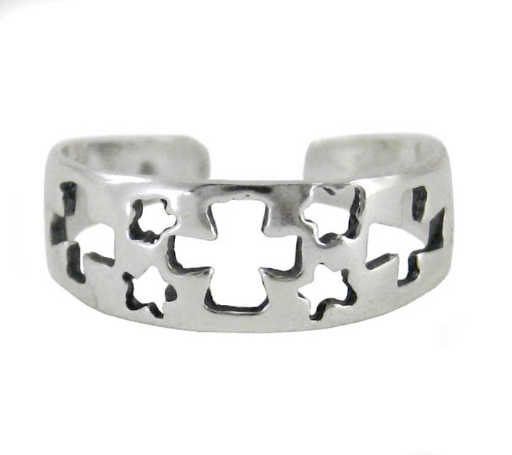 Open cutout crosses and little stars design across polished band toe ring is a great accent on your foot. Band toe ring is perfect summer accessorizing. Antique finish on polished silver. Slide on toe ring from the top of the toe, do not bend the band open. Adjustable toe ring accommodates many sizes. Photo enlarged to show details.
