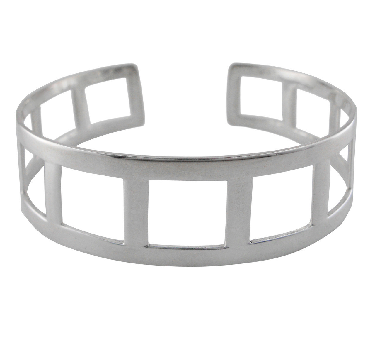 Sterling silver open cutout square cuff bracelet. Polished silver. 3/4 inch tall band. Approximately 2 1/2 inch wide interior width. Opening in the back to slide on wrist.
