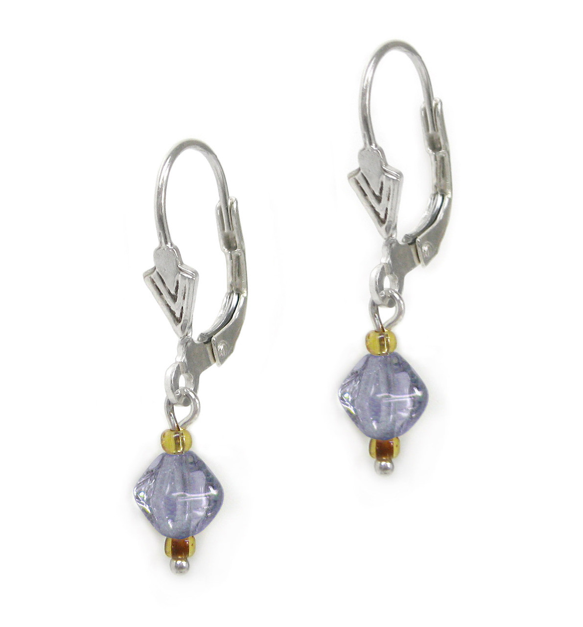 Loading... Please wait...Crystal drop earrings on secure leverback hooks. Bicone shaped Czech crystals are accented with seed beads and hangs on leverback earrings. Earring is approximately 1 1/8 inch drop including hook. Comfortable enough to wear everyday. Metal is sterling silver. Photo enlarged to show details.