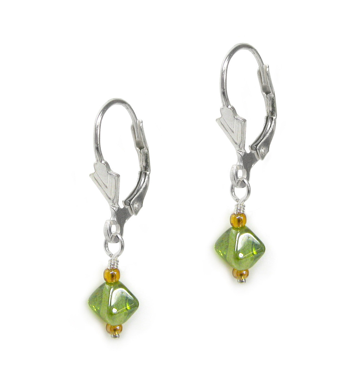 Loading... Please wait...Crystal drop earrings on secure leverback hooks. Bicone shaped Czech crystals are accented with seed beads and hangs on leverback earrings. Earring is approximately 1 1/8 inch drop including hook. Comfortable enough to wear everyday. Metal is sterling silver. Photo enlarged to show details.