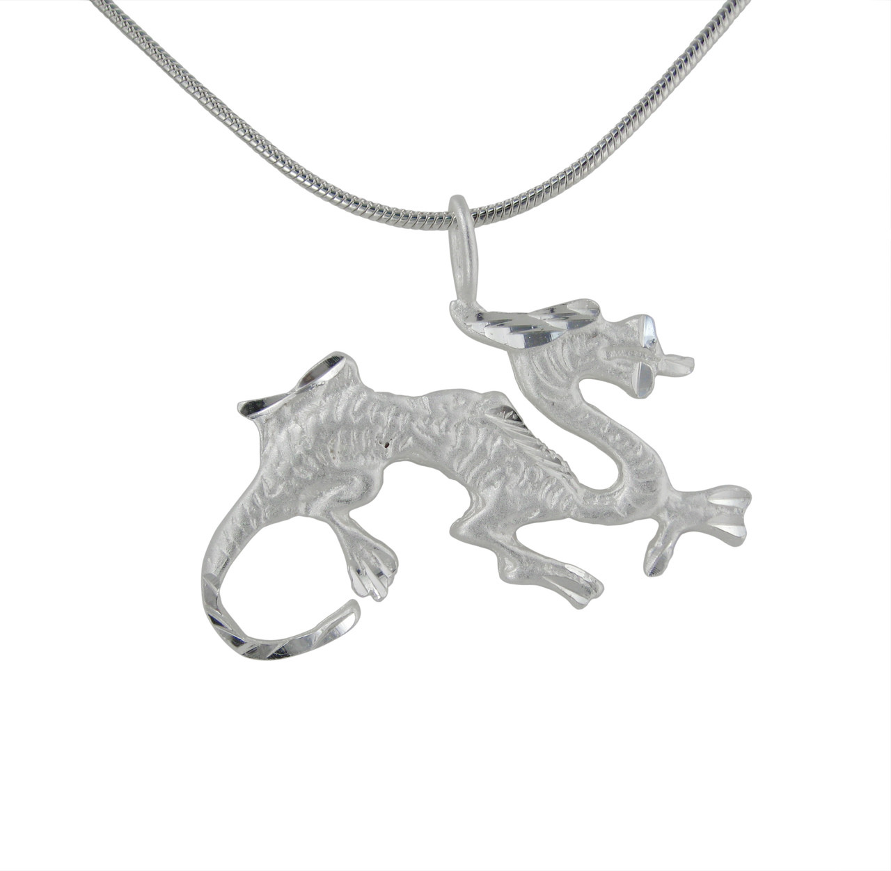 Loading... Please wait...Dragons have long captured our imaginations and have played a central part in many legendary tales from Game of Thrones to the Lord of the Rings. Sterling silver dragon necklace with matte finish and accented with diamond-etching to enhance details. Dragon is 1 1/8 inch wide. 15/16 inch tall with bail. Sterling silver chain included.