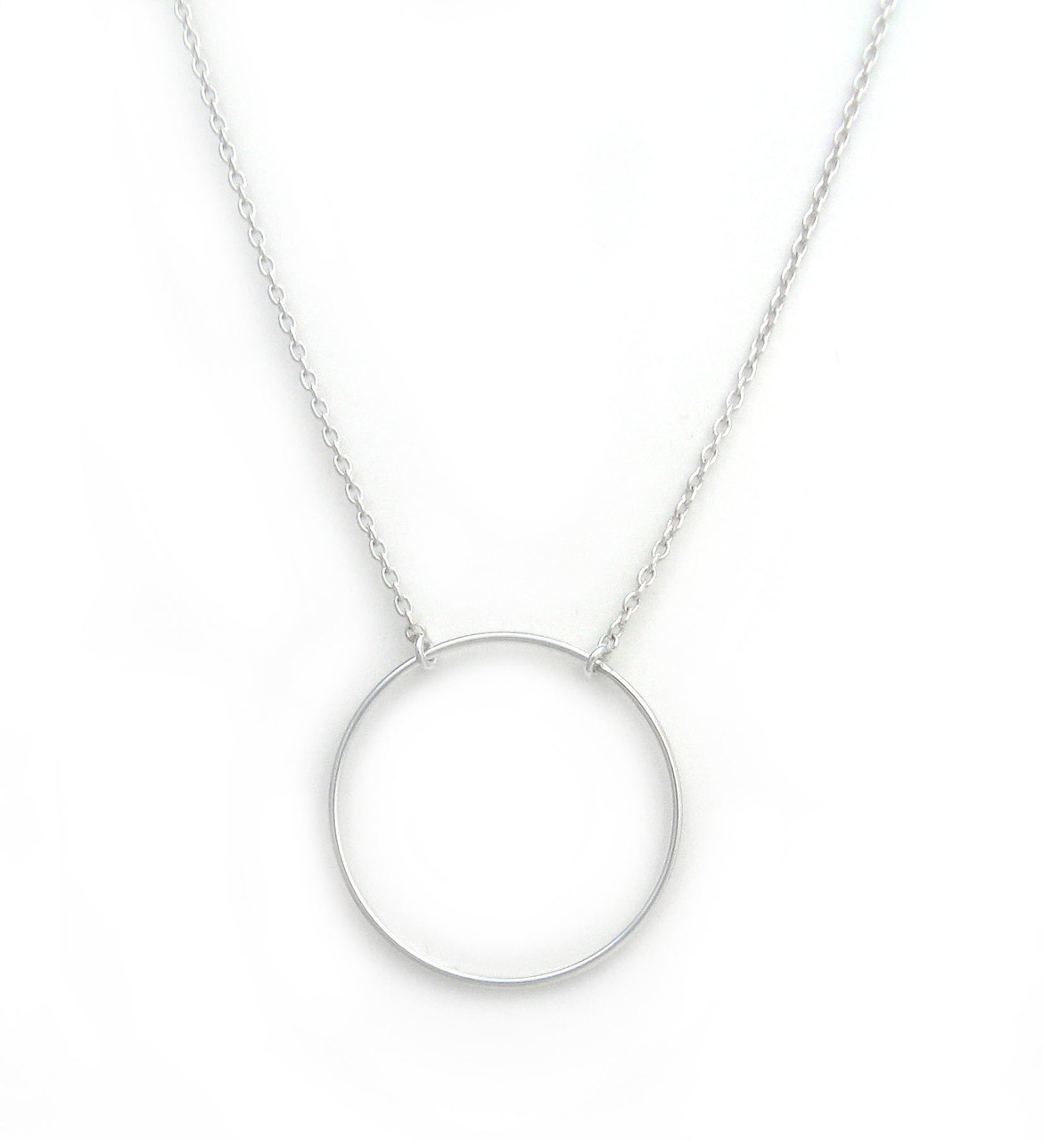 Loading... Please wait...Like the little black dress, this delicate circle necklace should be a classic in any wardrobe. Open circle charm in stationed at the center as the necklace chain is linked to the charm from each side. Elegant simple design gives this piece an open airy look which is so laid back cool! This piece will be perfect from the office meetings to the fun weekend with friends. Circle charm is approximately 1 1/16 inch wide. Chain necklace is 16 inch long with a 2 inch extender chain.