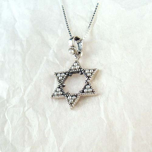 A vintage inspired Star of David pendant with faux seed pearls accented with an antique finish. The pendant measures 3 cm (approx. 1 1/4") from top to bottom and 2 cm across (3/4"). Italian box chain is included.