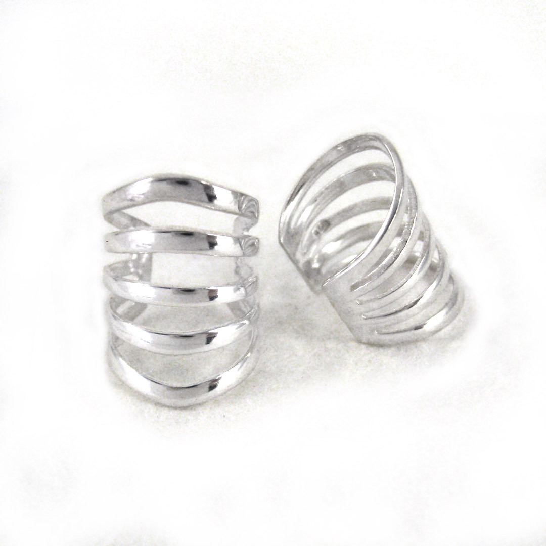 Five bands of polished silver ear cuff is a great accent on the ear. Ear cuff tapers to the back for comfortable wearing. No piercing needed to wear ear cuff. Photo enlarged to show details. Photo shows two angles of the ear cuff, please note the ear cuff is sold as an individual piece.