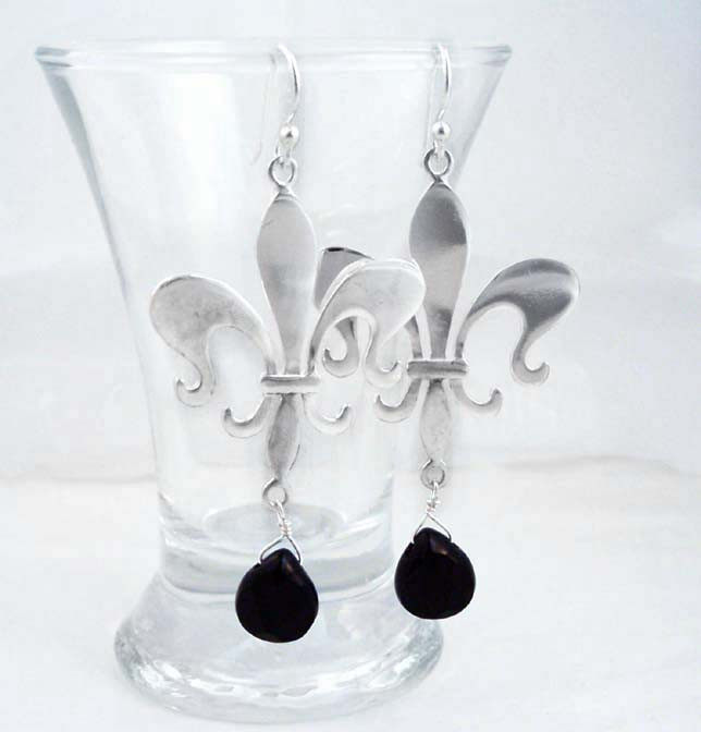 Sterling Silver Fleur de Lis Stone Drop Earrings, Black