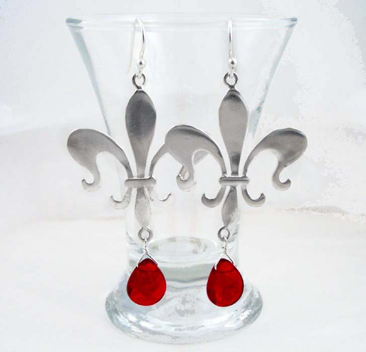 Sterling Silver Fleur de Lis Stone Drop Earrings, Red