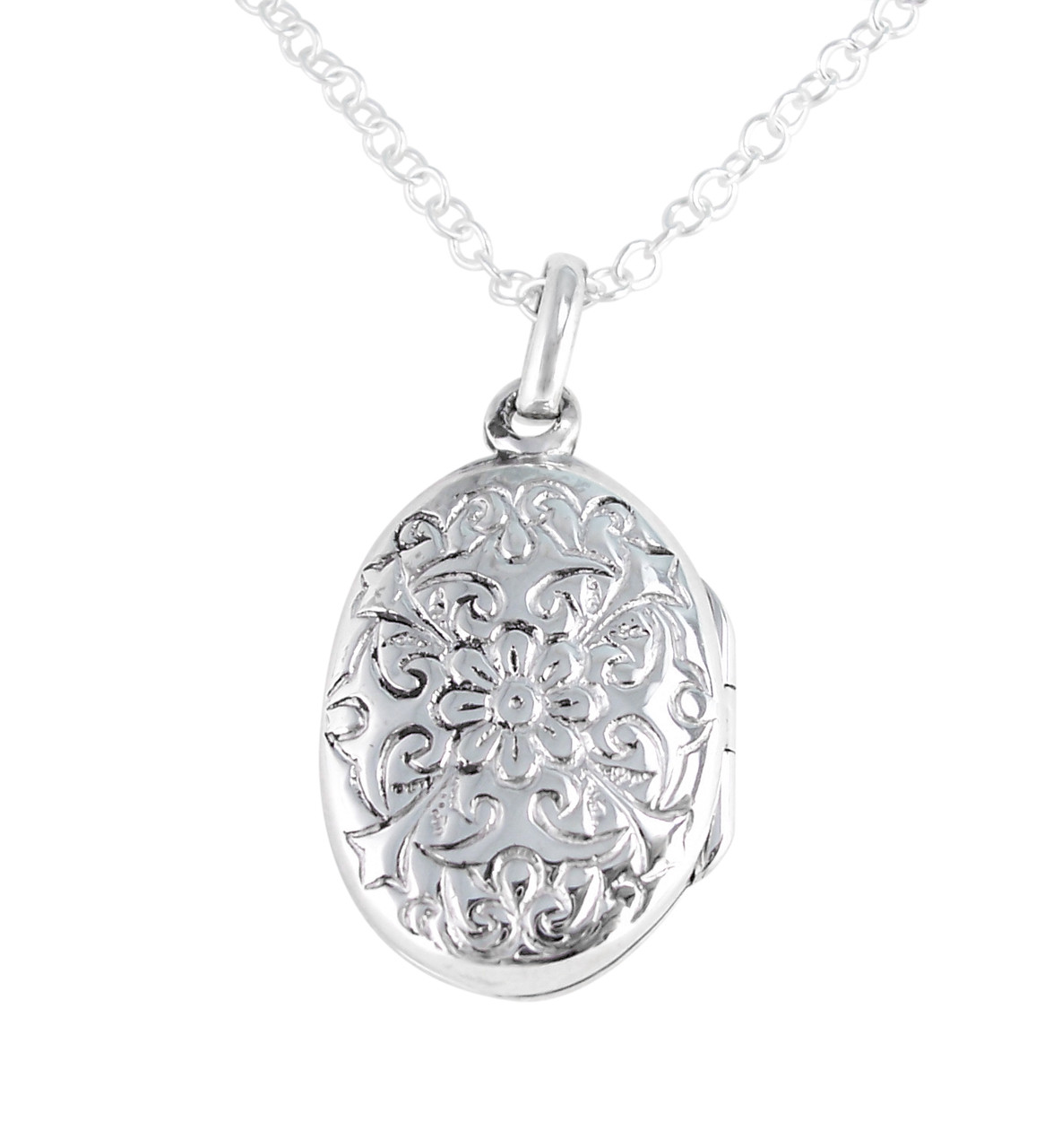 Click the button below to add the Sterling Silver Floral Pattern Oval Locket Necklace to your wish list.