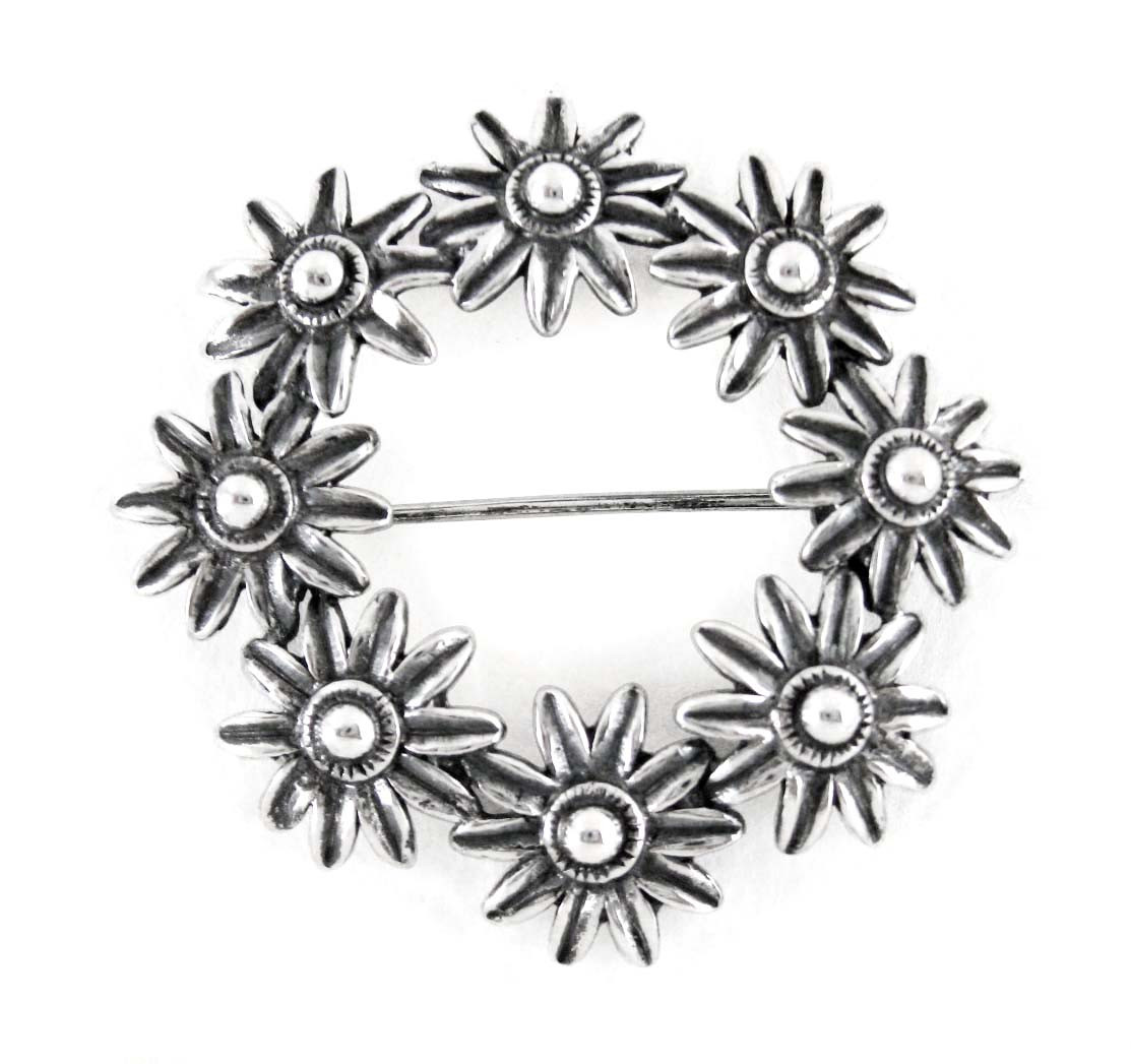 Loading... Please wait...Flowers arranged in a circle is a timeless classic piece you can wear all year round. Gorgeous on a lapel for work or on a dress for going out. Wear to secure your scarf in the winter for a modern twist! Photo enlarged to show details. Antique finish on sterling silver.