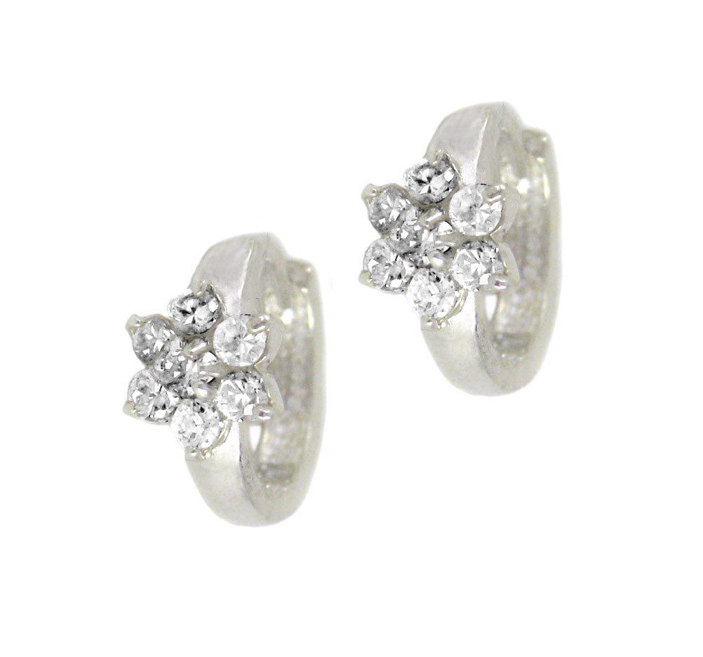 Sparkling crystals are prong set into a flower design on polished silver huggies hoop earrings. Perfect for work or play. Beautiful piece of jewelry for everyday dressing. Photos enlarged to show details.